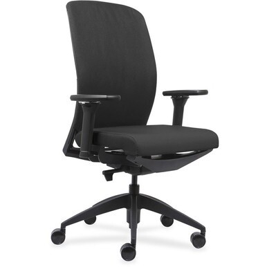 Executive, high-back swivel chair features adjustable lumbar support and upholstered seat and back. The suspended seat contains bands of rubber embedded in molded foam covered with high-quality, black vinyl. Frame is black. Integrated seat slider lets you set the seat exactly where you want it. A three-paddle control provides one-touch seat-height adjustment, four-position back lock and tilt tension. Six-way arms, adjustable tilt tension and four back-lock positions let you adjust the chair to meet your specific preferences. Arms move up and down; in and out; and forward and back for enhanced ergonomic support. Synchronized tilt control provides reduced front edge rise while reclining. When desired, a convenient back lock prevents the back from reclining. Soft-touch armrest pads provide comfort and protection for desks or tables. Fiberglass-infused, reinforced nylon base with high-performance casters delivers strength, support and comfort. Weight capacity is 250 lb.